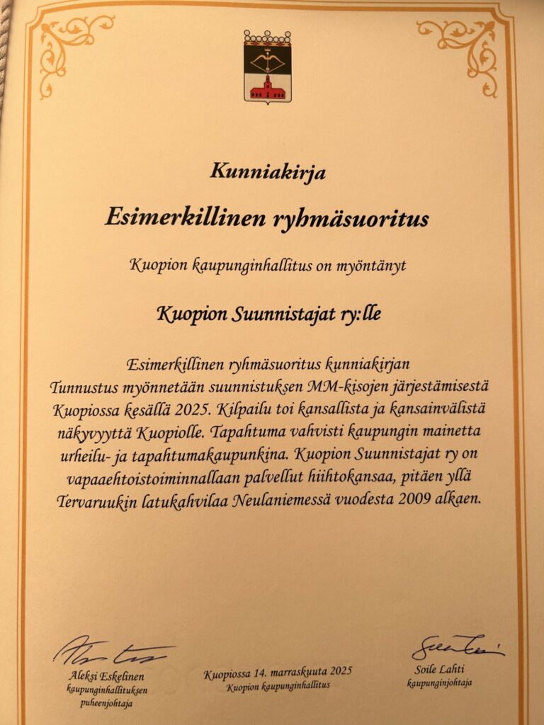 Kuopion Suunnistajat palkittiin suunnistuksen MM-kilpailujen toteuttamisesta Kuopiossa 2025